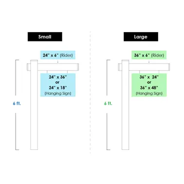 We offer Double Sided Aluminum Sandwich Board prints for long lasting outdoor graphics. Sizes available include: 24" x 18", 24" x 36" for the Small Post, 36" x 24" and 36" x 48" for the Large Post. Rider Signs are also available in 24" x 6" and 36” x 6”. Signs are pre-drilled for hanging from the Post Arm.