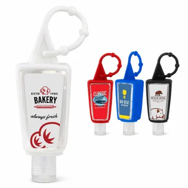 Get everyone in the loop with the 1 Oz. hand sanitizer with a removable silicone carabiner! Available in 6 colors, a convenient, silicone carabiner case is included with our 1 Oz. TSA approved, citrus-scented antibacterial hand sanitizer gel. Exceeding FDA standards, this product contains 62% alcohol, Also available without carabiner - see item HS1. **Clear label no longer available** **Item comes with white lid, new image coming soon** 5 working days after art approval for catalog qty. Complies with FDA, Prop 65, TSA. 3" W x 1.25" H